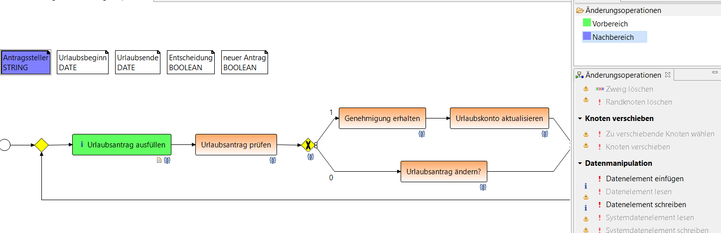 2. Datenfluss / Informationsfluss: Zum „Schreiben" eines Datenelementes muss ein Prozessschritt als Vor- und ein Datenelement als Nachbereich gewählt und die Änderungsoperation Datenelement schreiben angeklickt werden. Analog muss zum „Lesen" eines Datenelementes ein Datenelement als Vor-und ein Prozessschritt als Nachbereich gewählt und die ÄnderungsoperationDatenelement lesen angeklickt werden. Im Beispielprozess wird das Datenelement „Antragssteller" vom Knoten „Urlaubsantrag ausfüllen" geschrieben und vom Knoten „Urlaubsantrag prüfen" gelesen. Als Ergebnis ergibt sich: