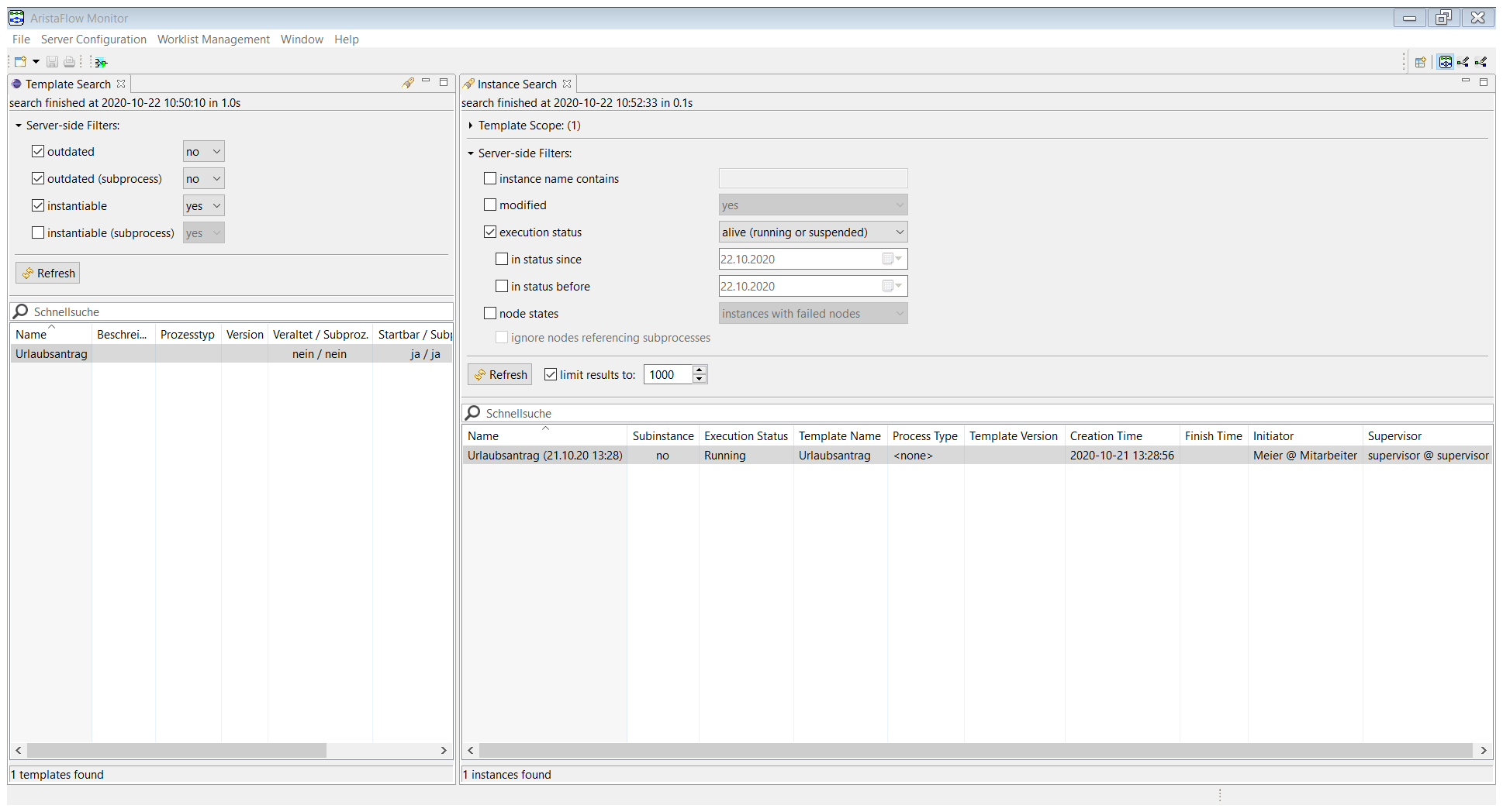 Selektieren Sie die Instanz (links unten) und klicken Sie im Rechtsklickmenü auf Open Instance Search for Template(s). Klicken Sie im Reiter Instance Search unten auf Refresh. Alle laufenden oder suspendierten (running or suspended) Instanzen des Urlaubsantrag Templates werden aufgelistet. Durch Doppelklick aufeine Instanz in der Liste können Sie die ausgewählte Instanz im Monitor beobachten.