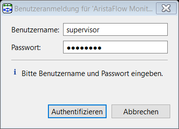 Authentifizieren Sie sich im erscheinenden Login-Dialog mit einem gültigen Benutzernamen und zugehörigem Passwort (im Auslieferungszustand mit supervisor/password).
