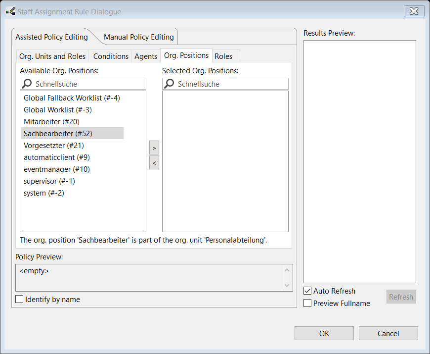 Der Staff Assignment Rule Wizard ermöglicht es im Manual Policy Editing Tab beliebig komplexe Bearbeiterzuordnungsregeln explizit einzugeben, um somit die gesamte Mächtigkeit des AristaFlow-OrgModelEditor nutzen zu können (z. B. Projektgruppen, Fähigkeiten, etc.).