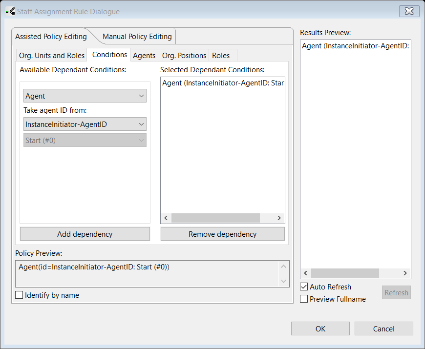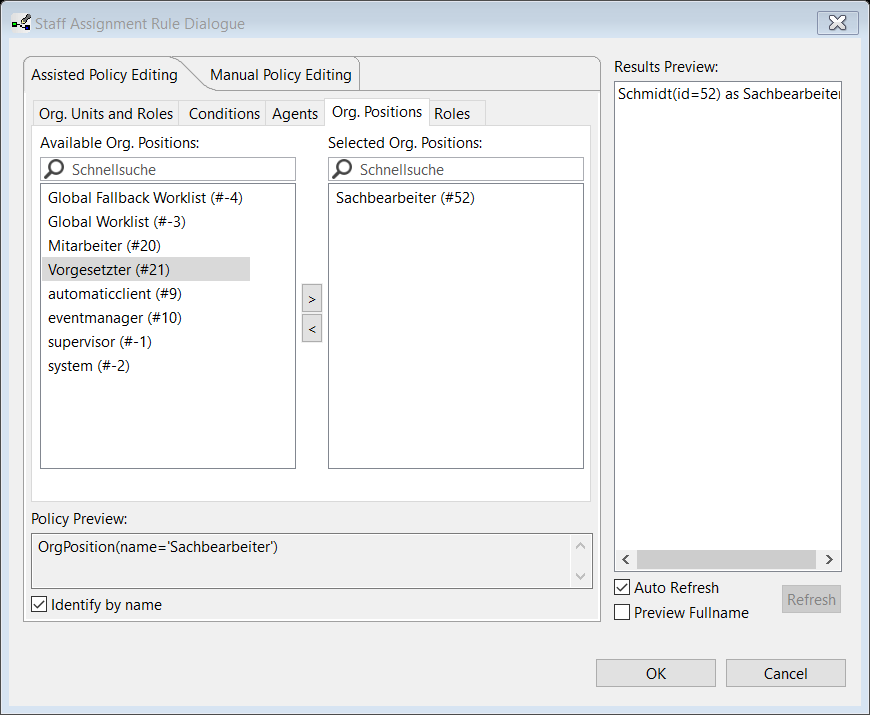 Bei komplexen Abhängigkeiten in Staff Assignment Rule Wizard können die Agents nicht durch den Namen identifiziert werden, da dies intern zu Uneindeutigkeiten bei der Bearbeiterzuweisung führen kann. Das ist in unserem Beispielsprozess bei „Urlaubsantrag ausfüllen“ (Prozessstarter) und „Urlaubsantrag prüfen“ (Vorgesetzter vom Prozessstarter) der Fall. Da werden die Agents durch ihre IDs identifiziert.