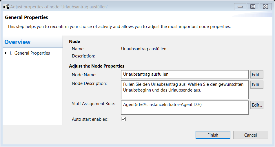 Da es sich beim Bearbeiter des Schrittes „Urlaubsantrag ausfüllen“ um den Starter der Instanz handelt, kann man die Ausführung dieses Schrittes mit dem Starten der Instanz verknüpfen. Dies führt später bei der Ausführung dazu, dass der Schritt „Urlaubsantrag ausfüllen“ sofort nach Starten der Instanz automatisch ausgeführt wird. Klicken Sie hierzu doppelt auf den Schritt „Urlaubsantrag ausfüllen“ und setzen Sie im erscheinenden Dialog ein Häkchen bei „Auto start enabled“.