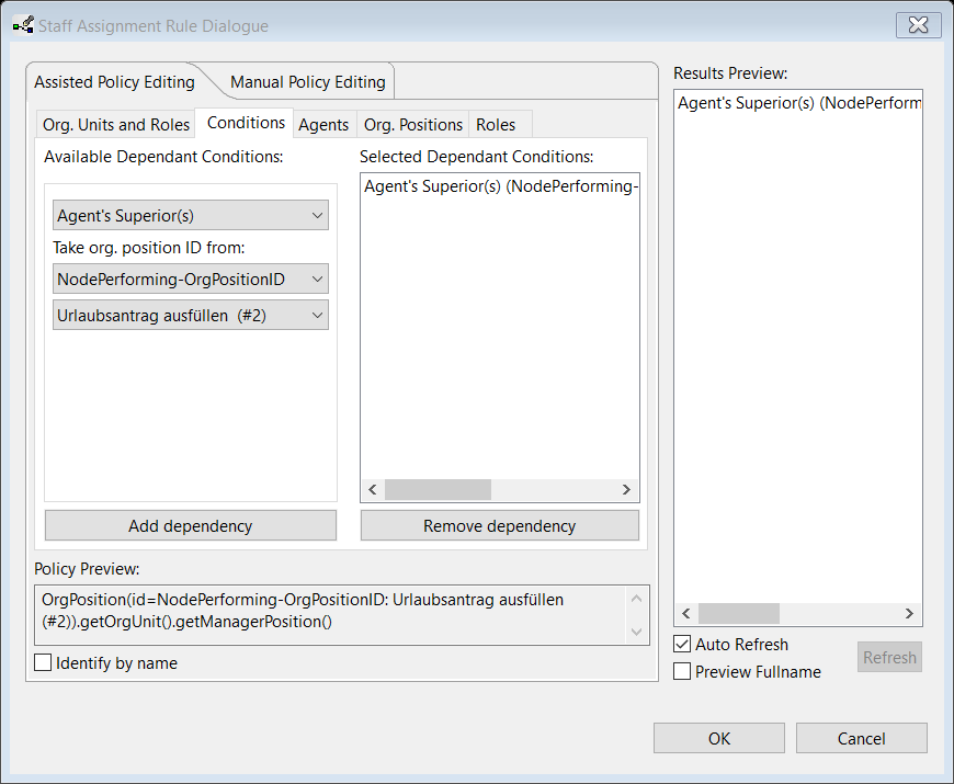 - Prozessschritt „Urlaubsantrag prüfen": Tab Conditions -> „Agent's Superior(s)" auswählen -> Als Agent-ID „NodePerforming - OrgPositonID" auswählen -> „Urlaubsantrag ausfüllen" auswählen und Add Dependency anklicken. Die Bearbeiterzuordnung ist nun so gewählt, dass immer der Vorgesetzte des Bearbeiters aus dem Schritt „Urlaubsantrag ausfüllen" also Schulz den Schritt „Urlaubsantrag prüfen" in seine Arbeitsliste bekommt.