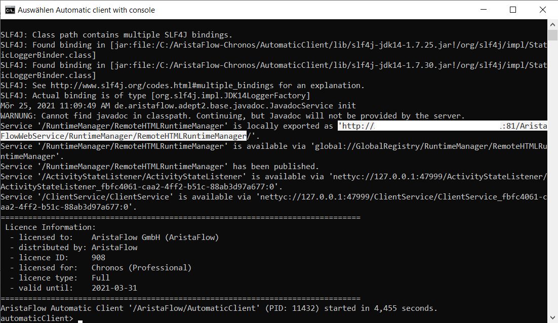LicenceManager.ExportVia = ${arflow:confVar.MainExportService}, ws OrgModelManager.ExportVia = ${arflow:confVar.MainExportService}, ws ProcessManager.ExportVia = ${arflow:confVar.MainExportService}, ws ExecutionManager.ExportVia = ${arflow:confVar.MainExportService}, ws WorklistManager.ExportVia = ${arflow:confVar.MainExportService}, ws RuntimeService.ExportVia = ${arflow:confVar.MainExportService}, ws - Die Datei für Automatic Client speichern Sie im Installationsverzeichnis unter dem Pfad ...\Aristaflow-Chronos\AutomaticClient\conf mit folgenden Daten: