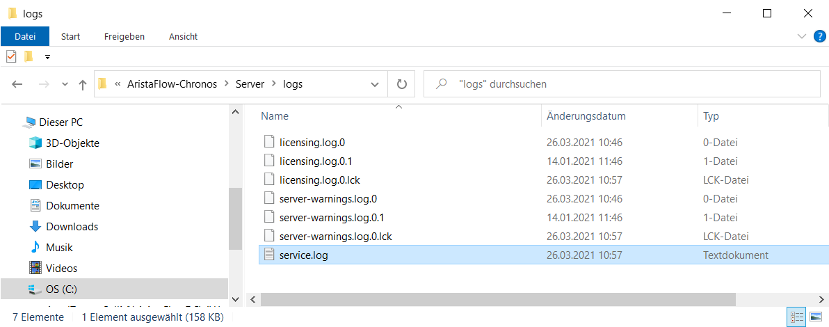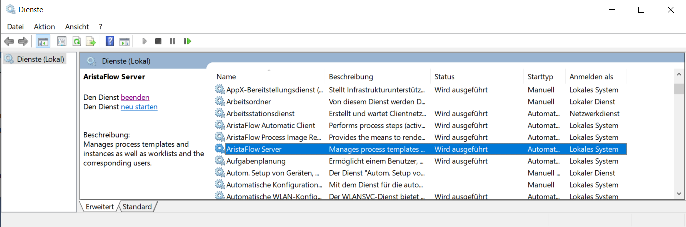 Hinweis: Wenn Sie die Server als Dienst unter Windows Dienste starten, dann finden Sie die http-URLs im Installationsverzeichnis des entsprechenden Servers unter dem Pfad ...\logs\service.log. Öffnen Sie diese Dateien in einem Editor und entnehmen die URLs mit AristaFlowWebService im Pfad.